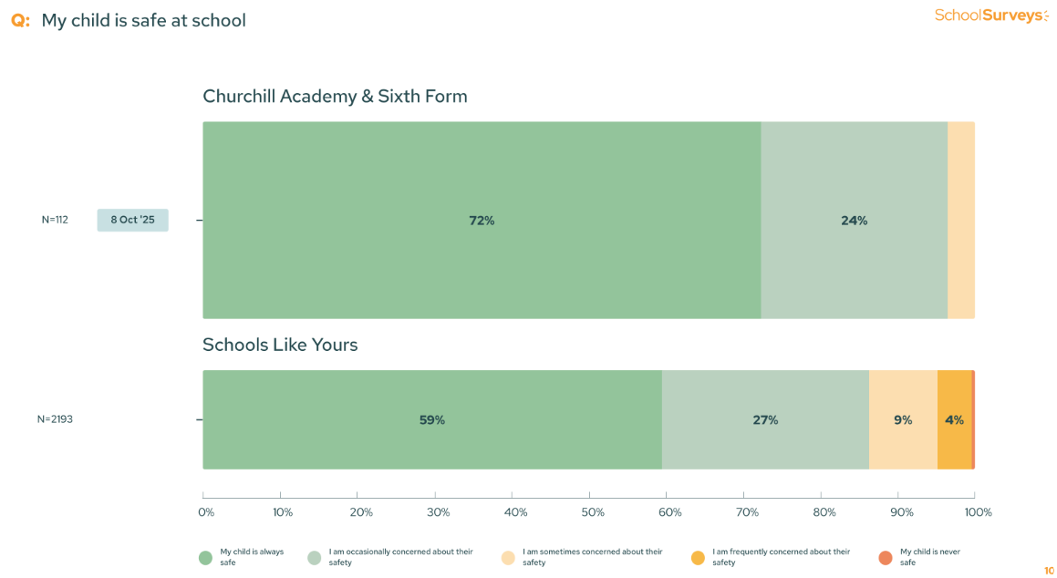 The survey also provided us with helpful points to ensure we keep improving our provision, including clear communication around specific areas and information for students unfamiliar with Churchill, concerns about site cleaning in certain areas of the school and feedback about the lunch queues. With this crucial feedback, we have been able to address all of these issues and ensure that we make the experience for families in the future even better than it is now.