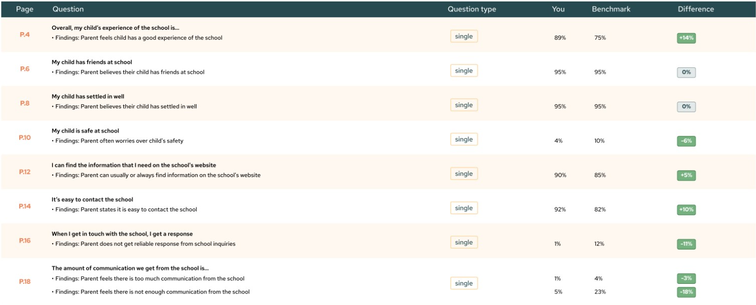 The results from the survey have been benchmarked against responses from similar schools, helping us gain a clear understanding of how the Academy compares with feedback from families at comparable schools nationwide. The image below provides an overview of the data for each question and how the Academy tracks against the benchmarked data.